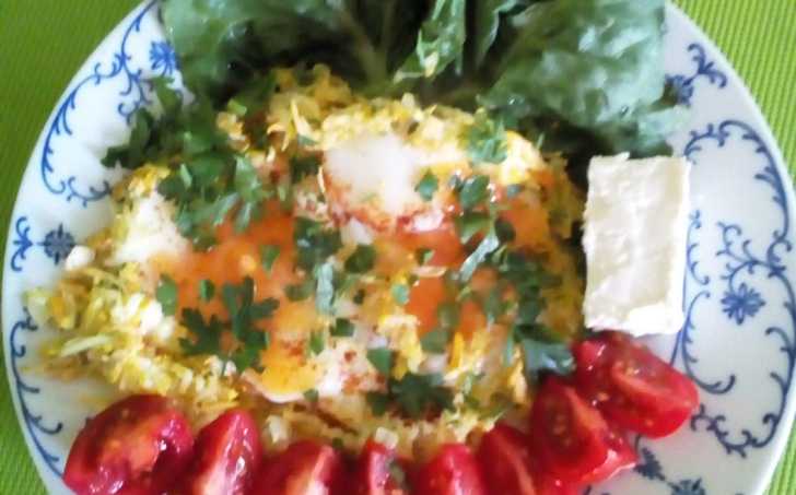 Směs si na pánvičce úhledně spojíme do placky, vyklepneme na ni vajíčka a restujeme dokud vajíčka neztuhnou.