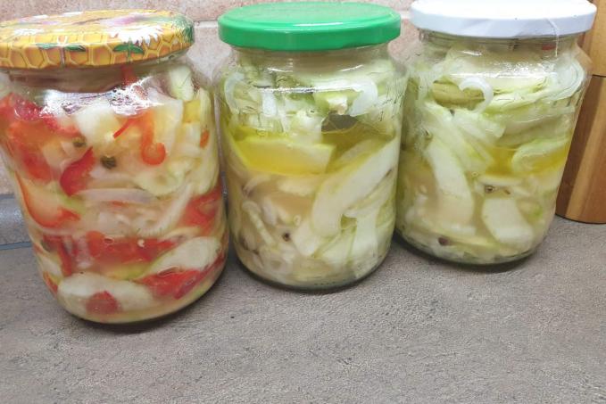Sůl a erythritol smíchal a promíchal v míse s cuketou a cibulí. Přidal kuličky koření a olej s octem. Po promíchání plnil 3 sklenice, do každé jsem dal 3 ks bobkového lístku. Do jedné ze sklenic jsem ještě přidal na tenko nakrájenou kapii. Chtěl jsem jednu sklenici ozvláštnit. Oboje jsou dobré, ale bez kapie jsou ,,matjesy,, zajímavější.
