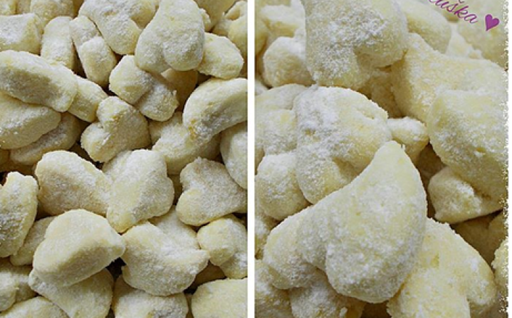 Vypracovat hladké těsto, případně na dopracování přidat trošku mouky.Vyválet asi půl centimetru, vypichovat tvary - dělám droboučké a péct ve vyhřáté troubě na 200st.než spodky lehce zrůžoví.
