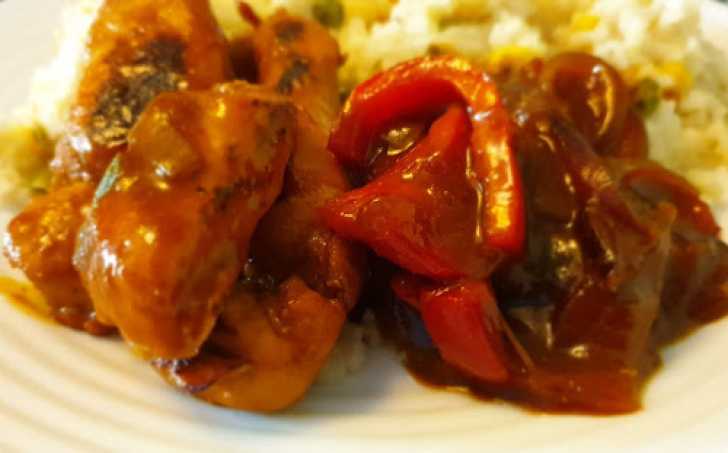 Na rozpálené nepřilnavé pánvi rychle zprudka na sucho opečeme maso, přidáme na drobno nakrájenou cibuli a na větší kousky nakrájenou papriku. Společně restujeme asi 5 minut.