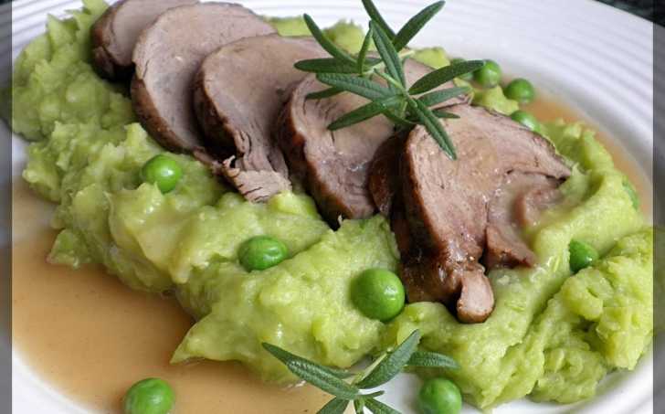 Hrášek uvaříme doměkka v osolené vodě a scedíme. Část hrášku si vždy odeberu stranou a vmíchám až do hotového pyré, hezky to pak na talíři vypadá. Zbytek projedeme v hrnci tyčovým mixerem a zakryjeme pokličkou, aby nám zbytečně nevychladl.