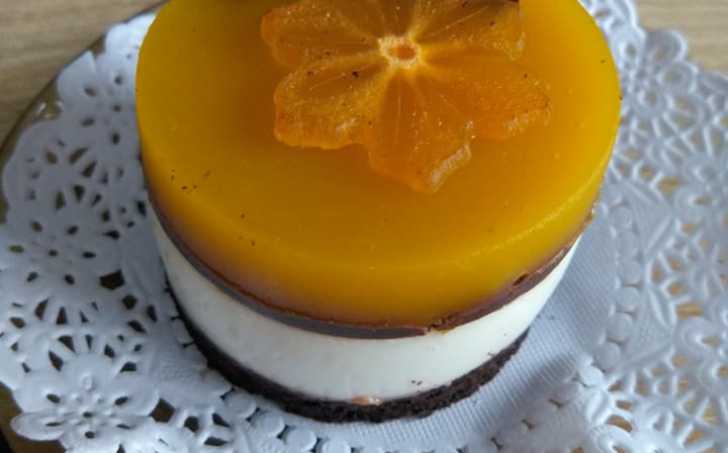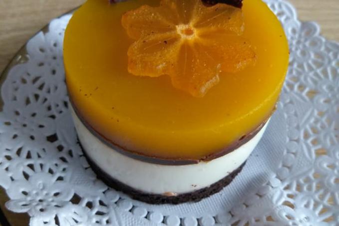 (fazolové brownies, tvaroh,tenká vrstva 90 % čokolády,dýňové želé)