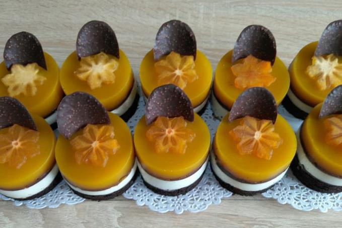 Formičkami vykrajujeme těsto,na těsto nalijeme tvarohovou náplň a necháme ztuhnout,Po ztuhnutí nalijeme tenkou vrstvu 90 % čokolády,necháme zatuhnout a nalijeme dýňové želé. Dortíčky necháme přes noc tuhnout a ráno opatrně z formiček vytlačíme.Z této dávky jsem měla 24 dortíčků.