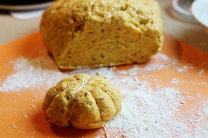 Moučnou směs promícháme se škrobem, přidáme sůl, kypřidlo, xantan, kmín. Promícháme. Do prostřed směsi dáme cukr a na něj sušené droždí. Opět promícháme. Přidáme teplou vodu a dýňové pyré. Vytvoříme rukou vláčné těsto, které necháme v teple cca 1 hodinu kynout v kynoucí míse s poklopem.