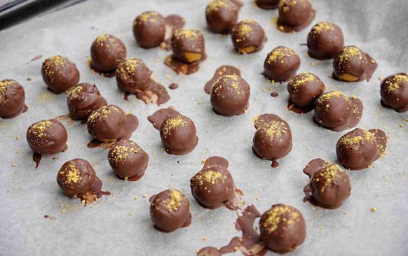 Mandlové máslo, dýňové pyré a kokosový olej jsem tyčovým mixérem rozmixovala na kaši, do které jsem vmíchala ostatní ingredience a připravila těsto. S těstem se ihned velmi dobře pracuje, a tak jsem z něho vyválela kuličky a nechala je 2 hodiny odpočívat v lednici. Následně jsem rozpustila čokoládu a kuličky napíchnuté na párátko jsem v čokoládě obalila a dala napíchnutou stranou dolů na pečící papír.