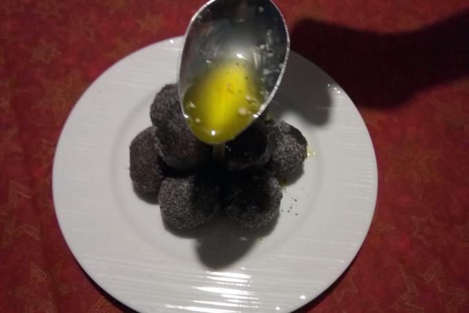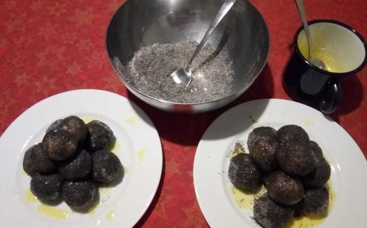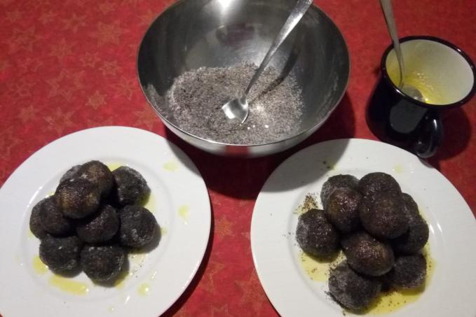 Vyndám z peřin, brambory s moukou rozšťouchám a vymíchám hladkou kaši. Pak tvaruju rukou kuličky velké asi jako vlašský ořech, dám je do velké mísy, posypu je mákem, moučkovým cukrem a zaliju rozpuštěným máslem.