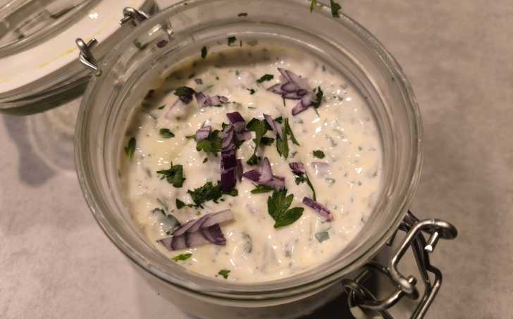 Čtyři vajíčka, mléko, citronovou šťávu, hořčici, pepř a sůl rozmixujeme dohladka - použít můžeme tyčový mixér. Přimícháme nadrobno nakrájené suroviny a jogurt. Vše smícháme a případně ještě dochutíme.