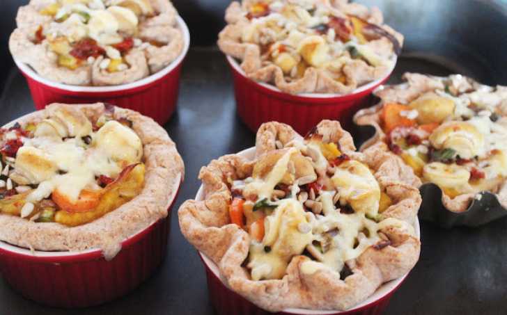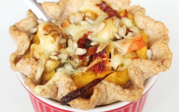 Po predpečení ho naplníme najprv s pyré, na ktoré kladieme zeleninku a tú posypeme slnečnicovými semienkami a nastrúhaným tvrdým syrom.