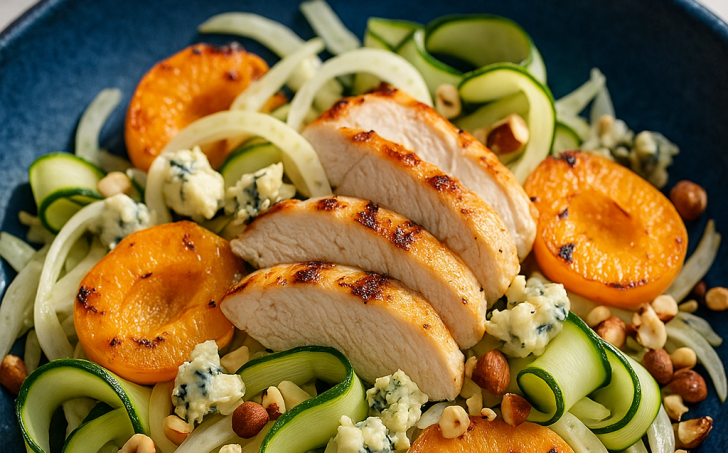 V malé misce smíchejte čekankový sirup, zbylý olivový olej, citronovou šťávu a trochu soli – vzniklou zálivkou promíchejte se salátem, fenyklem, cuketou a nasekanou bazalkou. Směs rozprostřete na talíře, navrch naaranžujte meruňky a opečené kuřecí maso, rozdrobte gorgonzolu a vše posypte nasekanými lískovými ořechy.