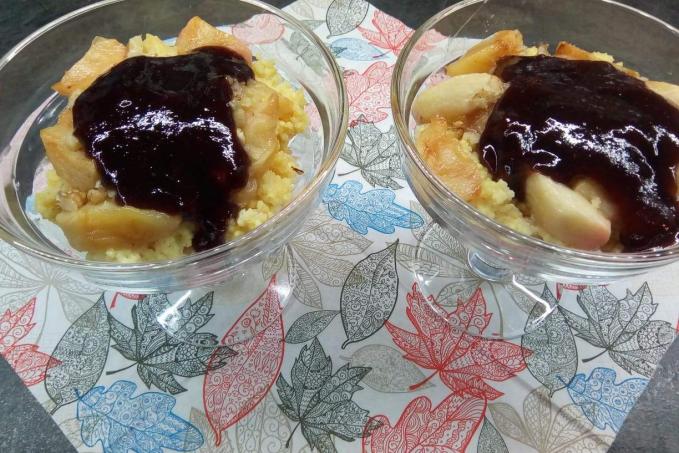 Do širokých misek dáme jáhly, přelijeme jablečným pyré a ozdobíme malinovým džemem a nasekanými ořechy.