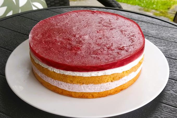Spodní díl korpusu jsem rovnoměrně pomazala jahodovým krémem. Přiklopila jsem horní díl korpusu a na něj jsem rozetřela bílý krém. Dala jsem prozatím do lednice.