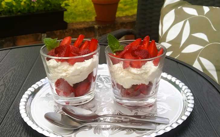 Do skleniček navrstvíme jahody a šlehačku. Můžeme ozdobit lístky máty.