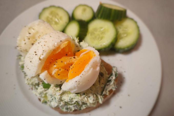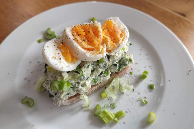 Uvařte a zchlaďte vajíčka. Chléb otoustujte nebo opečte v troubě. V mixéru mezitím smíchejte čerstvý hrášek, tvaroh, sýr, dle chuti citronovou šťávu, sůl a pepř. Pokud používáte mražený hrášek, nejprve ho krátce povařte ve vřelé vodě a následně rychle ochlaďte pod studenou vodou, aby si zachoval sytou zelenou barvu. Směs poté rozmixujte do hladka podle vaší preferované konzistence. Přidejte najemno nakrájenou pažitku. Pomazánku podávejte na toastech s vajíčkem. Dozdobit můžete pepřem, parmazánem nebo olivovým olejem.