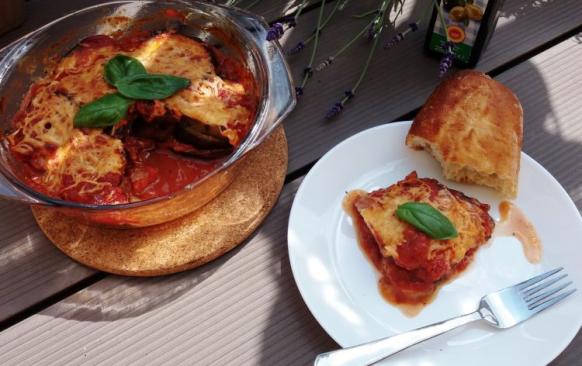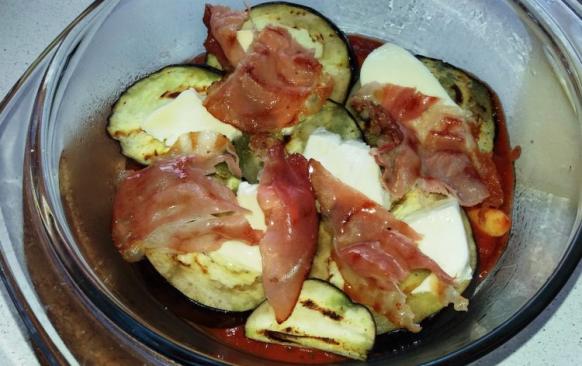 Předehřejte si troubu na 200 stupňů. Pekáček vytřete troškou oleje, na dno dejte část rajčatové omáčky, na ni položte opečený lilek, na něj opraženou šunku pokrájenou na kousky a kousky mozzarelly. Takto vrstvěte dál. Konečná vrstva bude rajčatová omáčka, na kterou nastrouhejte parmazán či sýr dle chuti (já tentokrát použila uzený).