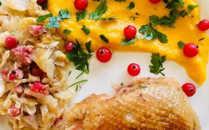 Kachnu jsem nejdříve trochu předpekla. Pak jsem ji “vypodložila” pokrájenou hlávkou zelí, to jsem zakápla červeným vinným octem a nasypala rybíz. No kompletně lahoda.