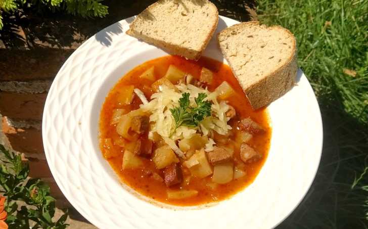 Poté jsem děrovanou lžící vyndala uzeninu a základ jsem promixovala tyčovým mixérem. Uzeninu jsem vrátila zpět do kastrolu a přidala kedluben nakrájený na kostičky a nechala vařit. Podle potřeby jsem ještě dolila vodu. Jak byl kedluben měkký (gigant se nerozvaří, u běžné kedlubny si to ohlídejte), přidala jsem bílou papriku nakrájenou na kousky a nechala vařit už jen krátce, aby papriky nebyly rozvařené, ale zůstaly na skus. Pak už stačí jen ochutnat a je-li třeba, dochutit dle vlastních preferencí.