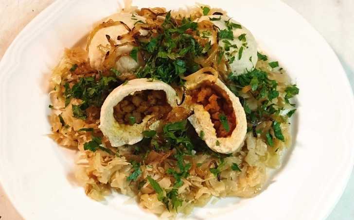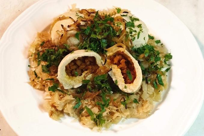 Na talíři jsem knedlíky posadila na dušené zelí, posypala je osmaženou cibulkou a nasekanou petrželkou.