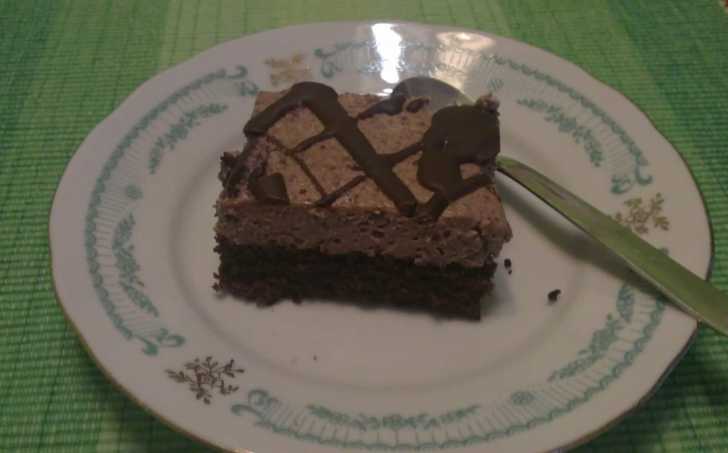 Na schladlé natřeme krém: šlehačky s cukry ušleháme, přišleháme tvaroh a umleté koka sušenky zvlhčené kávou.