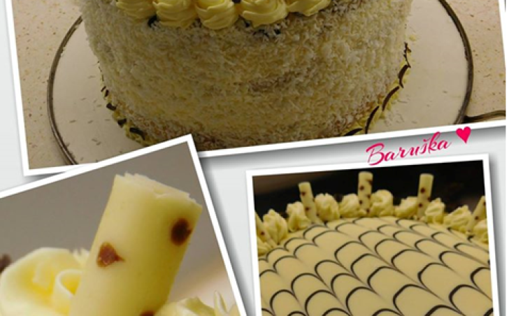Na střídačku vrstvíme korpusy a krémy - na kokosový krém jsem dala malé kostičky ananasu. Jedno patro sem pomázla marmeládou. Zdobíme dle fantazie - polila jsem bílou čoko a boky obalila v kokosu. Nechat chladit.