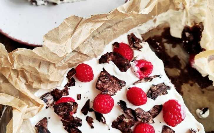 Na vychladlý korpus nalijeme krém a necháme v lednici vychladit. Ozdobíme malinami a kokosovými chipsy.