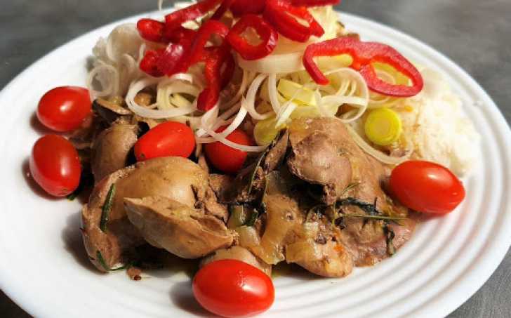 Cibuli nakrájíme na drobno a játra na větší kousky. Vložíme do hrnce, přidáme bylinky (lupínka bez větviček), kmín a mírně podlijeme vývarem. Nesolíme, aby játra neztvrdla.