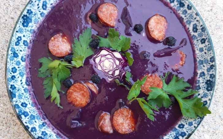 Rozmixovat, přidat pokrájenou čerstvou zelenou petrželku a kousky orestované klobásy. Můžeme servírovat se lžící zakysané smetany.