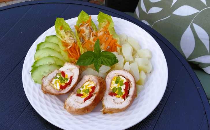 1. Roláda: krůtí prso (cca 1 kg) dle potřeby nakrojit a rozklepat tak, aby vnikl pěkný obdélník. Osolit, opepřit, pomazat dijónskou hořčicí (2 lžičky). Poklást plátky anglické slaniny (10 plátků) a polotvrdého sýru (dala jsem tři plátky 45% Eidamu). Náplň smažená vajíčka (5 ks), hrášek (cca 60 g) a jedna kapie nakrájená na proužky.