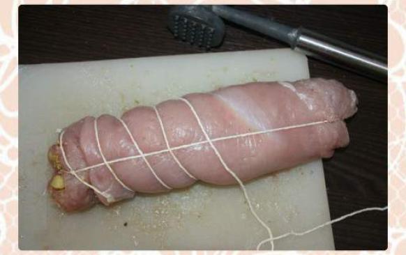 Krůtí maso nařežte tak, aby tvořilo co největší plát. Na něj položte potravinářskou folii či mikrotenový sáček a rozklepejte na sílu něco málo pod jeden centimetr. Maso osolte a opepřete. Navrstvěte nádivku po celé ploše masa a opatrně zamotejte. Provázkem nejdříve zajistěte podélně, poté obmotávejte kolem dokola.