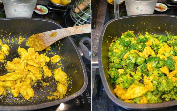Hotovou pastu dám do nepřilnavé pánve, teplotu zapnu na střední stupeň a nechám pastu vařit pár minut, až se začne uvolňovat aroma. Následně do pasty přidám na nudličky pokrájené kuřecí maso a citrónovou šťávu a za stálého míchání vařím 5 minut. Do směsi přidám brokolicové růžičky a fazolové lusky a vařím další 3 minuty za stálého míchání.