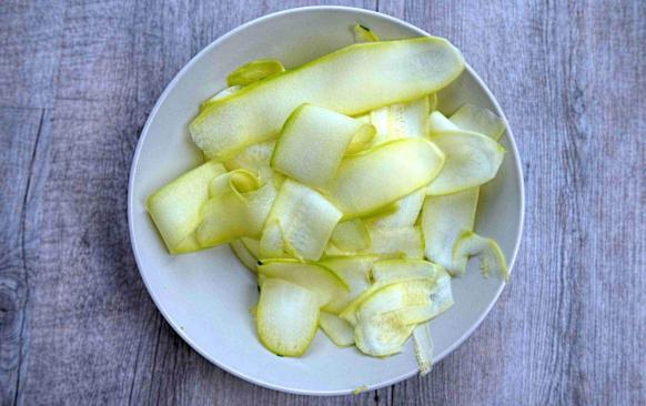 Zatímco se mi směs dusí, připravím si cuketové nudle tak, že cuketu škrabadlem na brambory (takové to škrabadlo ve tvaru praku) podélně nastrouhám na tenké, dlouhé nudle (můžete použít i spiralizér na tvorbu nudlí).
