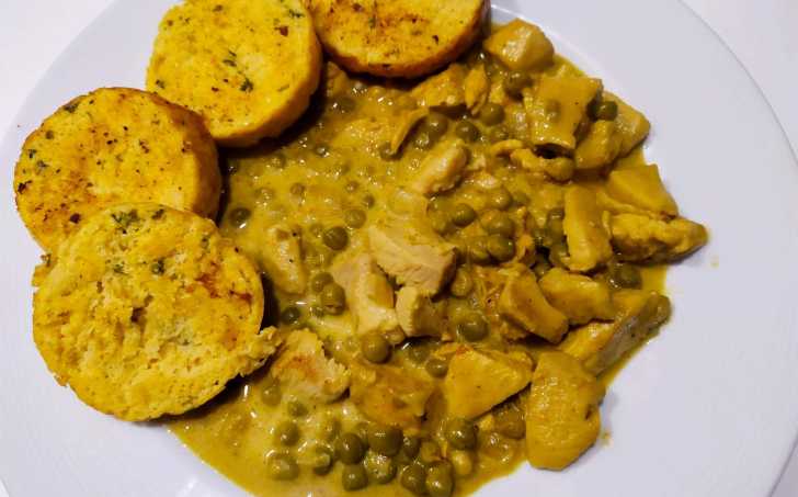 Na sádle osmahneme na kostičky nakrájené maso. Přidáme cibulku a spolu s masem osmahneme, než zesklovatí. Přidáme sůl, koření a kokosové mléko. Na mírném plameni podusíme několik minut, dokud není kuře hotové. Přidáme smetanu, hrášek (lze použít mražený i sterilovaný) a ještě prohřejeme.