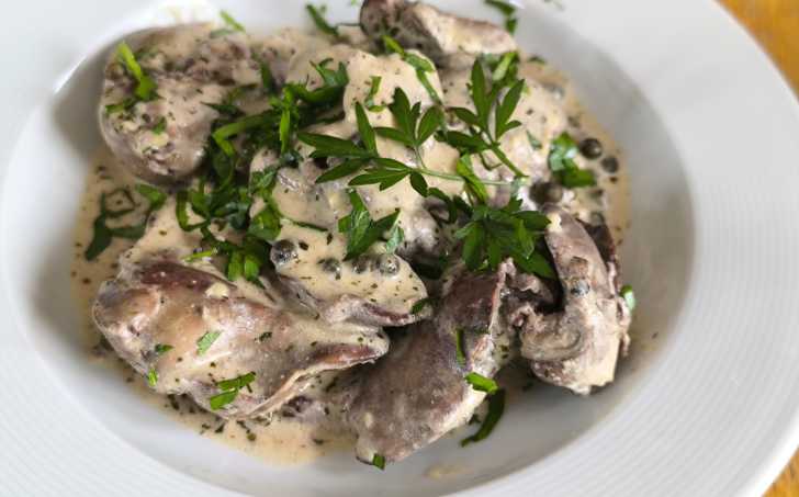 Kuřecí játra ve smetanové omáčce se sýrem a zeleným pepřem