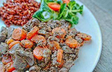 Maso nakrájíme na kostičky, dýni očistíme a nakrájíme na drobno, cibuli na jemno.
