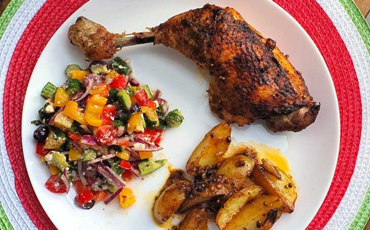 Kuřecí stehno s bramborem a řeckým salátem – chutné, vyvážené jídlo, které spojuje šťavnaté pečené maso s lehkostí středomořského salátu. Skvělá volba, když chcete sytý oběd i dávku svěží zeleniny na jednom talíři. Porci brambor lze upravit podle typu diety :-)