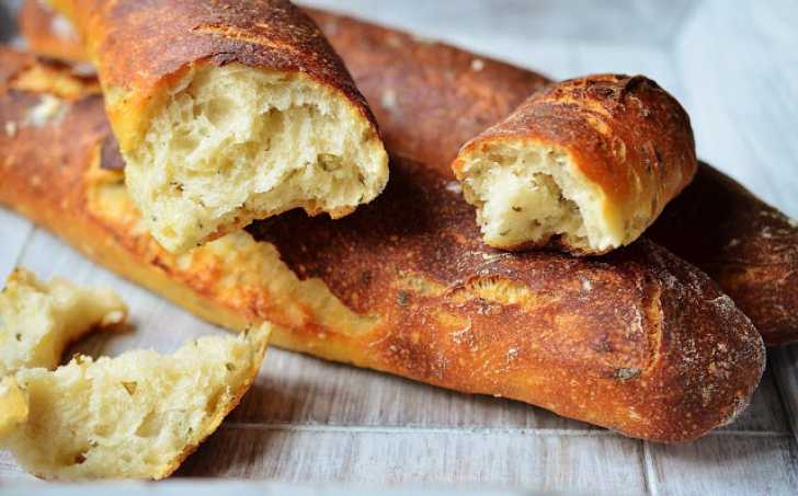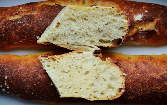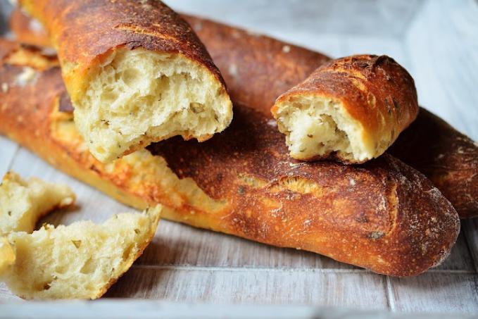 Občas se stane, že není pánbu doma, jak se říká. Pak se taky stane, že není doma droždí, když vy jste si zrovna usmysleli upéct jako přílohu nějakou bílou "něcojakobagetu". A vzpomenete si ten večer, kdy byste si měli založit nějaký preferment. To jsme pak všichni rádi za kvásek, že? No vida. Tak přesně takhle se mi to stalo minulý víkend, i nelenila jsem, přes noc rozkvasila a druhý den zkusila od boku vystřelit něco jako bagety. Střída je i druhý den (ano, opět u baget volně ložených na vzduchu) krásně vláčná a měkká, kůrka už samozřejmě o svou chrumkavost přišla, ale pořád je pevná a ne gumovitá. Posun oproti těm zadělávaným vodou je fakt dramatický. A to mi přijde dostačující.