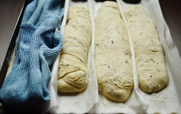 Vyklopte těsto na dobře pomoučněný vál, párkrát z každé strany přeložte a nechte chvíli odpočinout. Pak těsto rozdělte naolejovanou nebo pomoučněnou stěrkou na tři zhruba stejně velké díly. A teď už k tomu přistupte kreativně. Každý díl ještě jemně přeložte a pak ho vytáhněte do délky, zakruťte a máte kořenovou bagetu. Nebo si na youtube nastudujte, jak se modeluje pravá bageta, nebo jen ušoulejte váleček. Pro konečnou chuť to má nulový význam.
