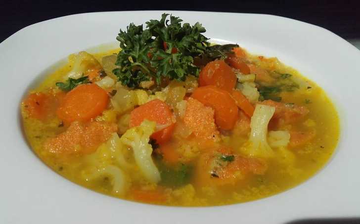 Na trošce přepuštěného másla necháme zesklovatět 1 cibuli.Přidáme pokrájenou mrkev,1 stonek řapíkatého celeru,2 menší brambory a půlku květáku rozebraného na růžičky.Chvíli společně opékáme,osolíme,1 lžíci podravky,1 malou lžičku kari a trošku sušeného medvědího česneku.