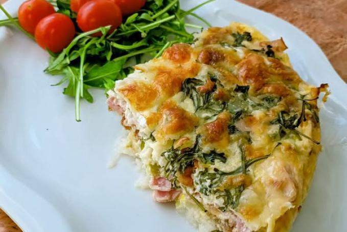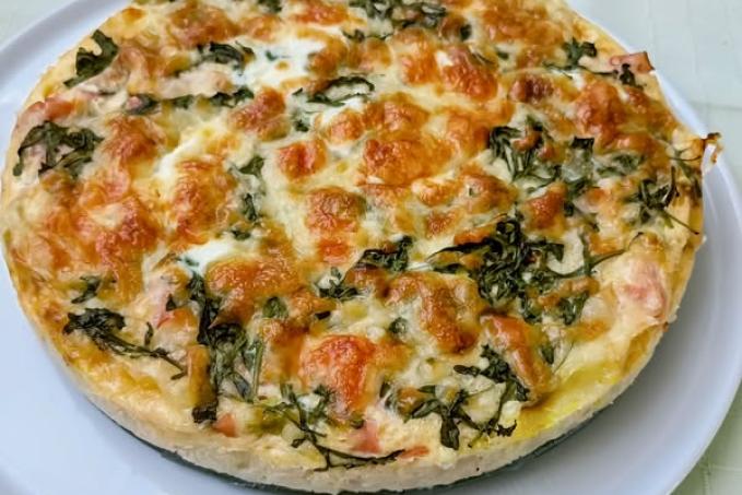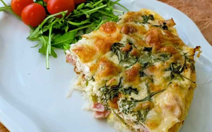 Posypeme nadrobno nakrájenou šunkou a polovinou nastrouhaného sýra. Pak poklademe rukolou nebo baby špenátem. Do misky vlijeme smetanu, přidáme 3 vejce a metlou rozšleháme, vmícháme nastrouhaný sýr a koláč zalijeme.