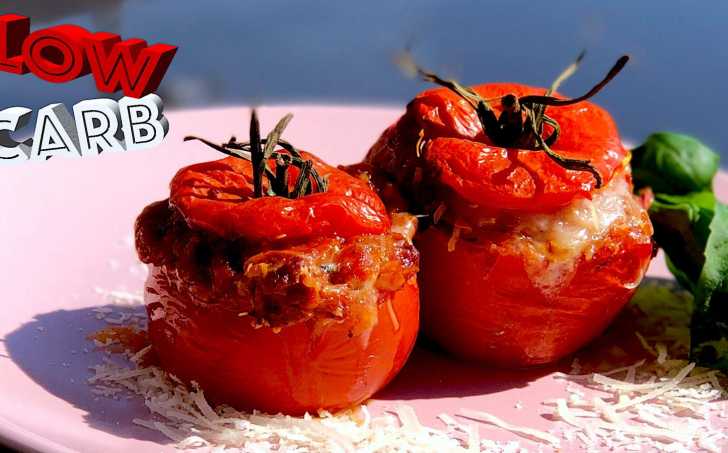Rajčata vydlabeme, posypeme parmazánem, naplníme směsí, a dáme zapéct do trouby.