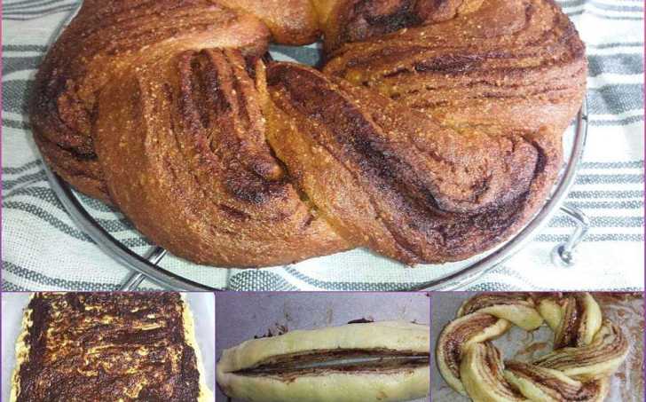 Vyválet těsto, potřít skořicí, zamotat jako roládu, rozříznout a zamotat.