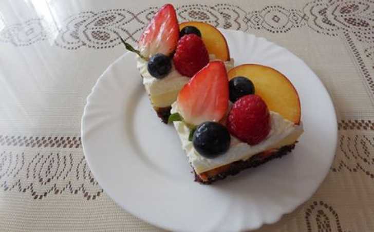Potom ušleháme obě šlehačky se ztužovači a natřeme na pudinkový krém. Dáme opět do lednice ztuhnout asi na 1 hodinu. Pak nakrájíme a ozdobíme ovocem.