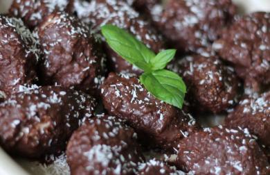 Do mixeru dáme pomletý mák a sušené švestky. Pokud jsou švestky přesušené, doporučuji je na půl hodinky namočit a před mixováním vymačkat nadbytečnou vodu. Mák se švestkami rozmixujeme. Vytvoří se sušší hmota, kterou spojíme tak, že do směsi přilejeme agávový sirup (lze použít i sirup javorový nebo med). Ještě jednou promixujeme, aby se hmota stala kompaktní, nerozpadala se a daly se zní tak vytvarovat kuličky. Nyní si namočíme ruce a postupně kuličky tvarujeme a obalujeme v konopném semínku.
