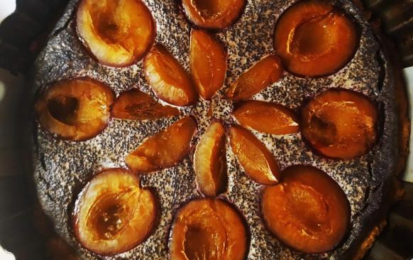 Náplň rozprostřít na předpečený korpus, přidat půlky švestek a dát dopéct na stejnou teplotu na 30-35 minut.