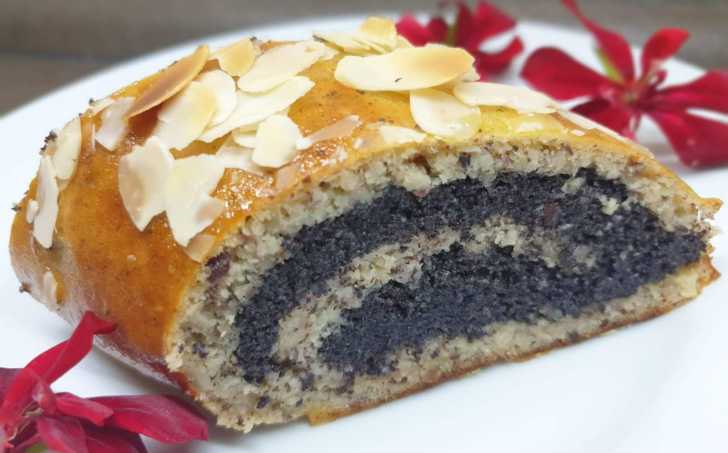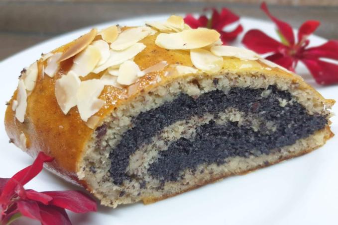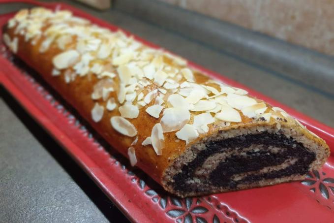 Plech s korpusem jsem vyndal a nechal okamžik chladnout, ještě teplý otočil na druhý pečící papír a ten první opatrně sloupl. Než se korpus upekl, v rendlíku jsem zahřál smetanu se sladidlem a ještě před varem přidal mák, odstavil a dobře promíchal. Náplň jsem rovnoměrně pokladl na korpus a opatrně zamotal. Závin jsem mašlovačkou pomazal žloutkem a posypal plátky mandlí. Na novém papíru jsem pekl, už zamotaný, dalších 20 minut na 180 °C.