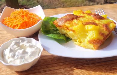 Vše smícháme v misce vhodné do mikrovlnné trouby a zapneme na tři a půl minuty. Poté vyklepneme na pánev a na sucho opečeme dozlatova.