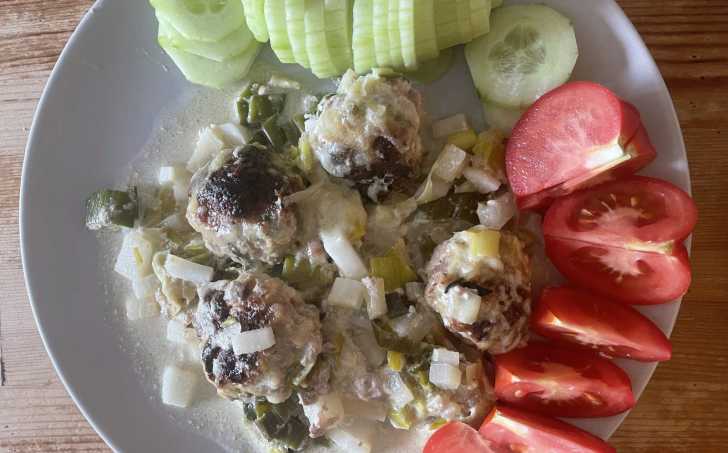 Část směsi odebereme (cca. 1/3) a nasekáme ji najemno a smícháme s mletým masem a vejcem. Osolíme, opepříme a uděláme si asi 20 masových koulí.