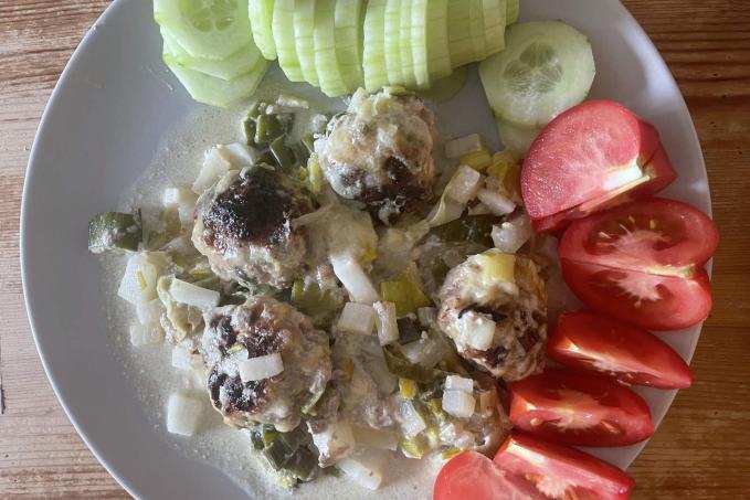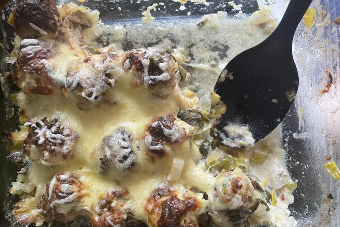 Do pekáče na dno naklademe na malé kostičky nakrájenou ředkev promíchanou se zbytkem pórkové směsi a na tu klademe masové koule. Vše zalijeme smetanou promíchanou s hořčicí a posypeme částí sýra.