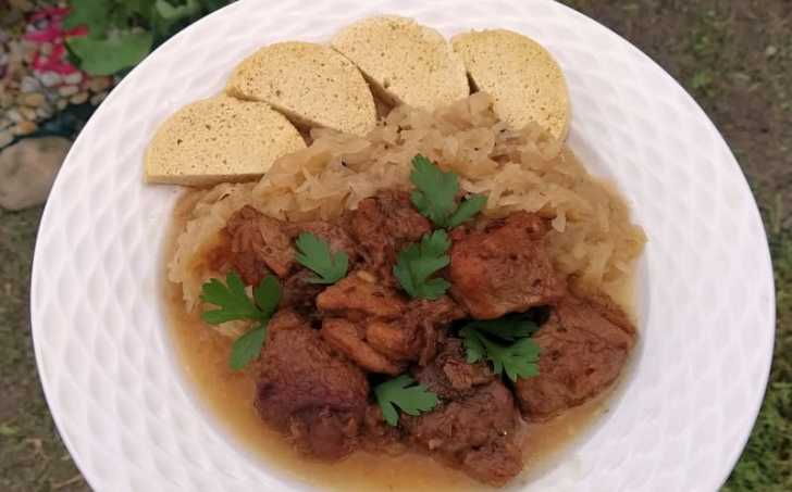 Maso jsem nakrájela na větší kousky. Na velké hlubší pánvi jsem osmažila drobně nakrájenou cibuli do zlatohněda. Ke konci jsem přidala prolisovaný česnek. Postupně jsem přidávala a opékala maso, aby se pěkně zatáhlo. Maso jsem osolila, opepřila a posypala kmínem. Vše jsem důkladně promíchala a přendala do varného skla. Podlila jsem 1,5 dcl vody, přiklopila a vložila do vyhřáté trouby. Pekla jsem asi hodinu a půl.