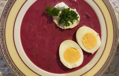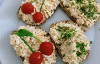 Knedlíky: Sýr se solí a vejci jsem prošlehala. Přimíchala jsem prášek do pečiva, mouku a bramborovou vlákninu. Důkladně jsem promíchala a přidala ještě trochu mléka. Směs jsem rozdělila do dvou hrnků vymazaných máslem. Dala jsem do mikrovlnky na 2,5 minuty. Dávám každý hrnek samostatně.