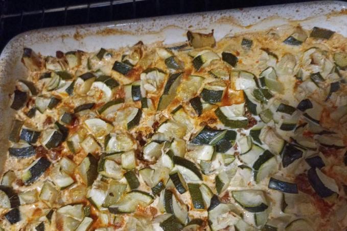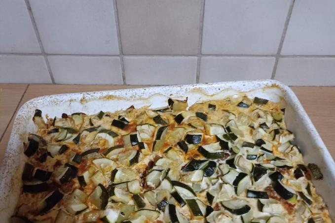 Cuketu nakrájíme na malé kostičky. Polovinu vložíme do pekáčku.